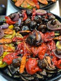 Balsamic crust, topped with an arugula salad, fresh mozzarella, tomatoes, roasted vegetables.
